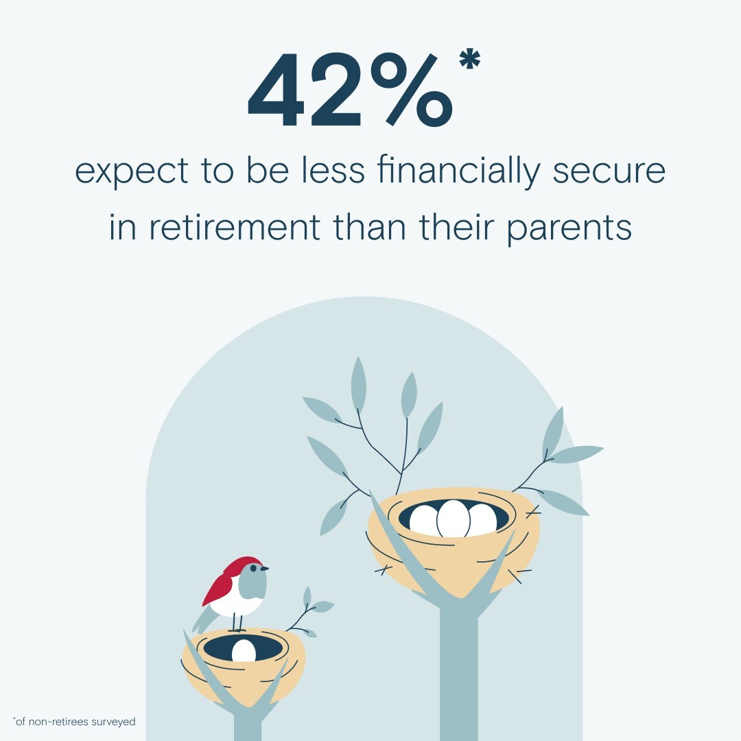 - Growing Anxiety, Shrinking Confidence: 42% of non-retirees surveyed expect to be less financially secure in retirement than their parents, and 42% feel uncertainty when thinking about their own retirement. 44% of non-retirees lack confidence they're saving enough to retire when planned.